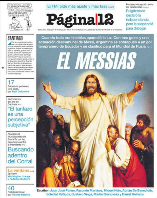 Όπως είναι λογικό ο Τύπος στην Αργεντινή αποθεώνει τον ποδοσφαιρικό ηγέτη της χώρας με την εφημερίδα “Pagina 12” να το… τερματίζει “παίζοντας” με το όνομα του Μέσι, καθώς τον “βάφτισε” Μεσσία και τον έντυσε Ιησού Χριστό.