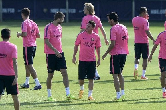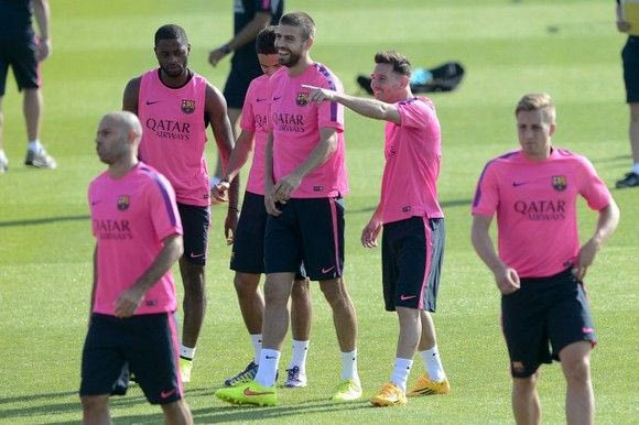 Barcelona's defender Gerard Pique (3R) and Barcelona's Argentinian forward Lionel Messi (R) take part in a training session at the Sports Center FC Barcelona Joan Gamper in Sant Joan Despi, near Barcelona on August 5, 2014. AFP PHOTO/ JOSEP LAGO