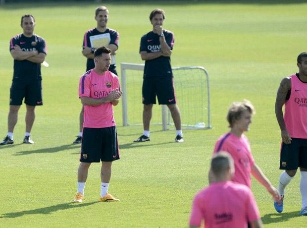 Barcelona's Argentinian forward Lionel Messi (C) takes part in a training session at the Sports Center FC Barcelona Joan Gamper in Sant Joan Despi, near Barcelona, on August 5, 2014. AFP PHOTO / JOSEP LAGO
