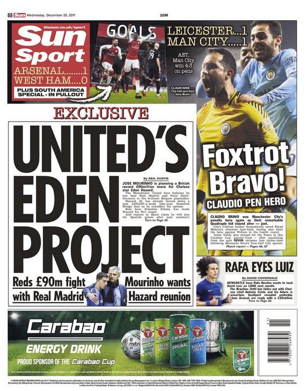 Φωτιές στην… Τσέλσι βάζει με σημερινό πρωτοσέλιδό της η αγγλική “Sun” καθώς σύμφωνα με δημοσίευμα που έχει το χαρακτήρα “exlusive” (αποκλειστικό), δεν είναι μόνο η Ρεάλ και η Παρί που ενδιαφέρονται για τον Εντέν Αζάρ αφού στο κόλπο μπαίνει γερά και η Μάντσεστερ Γιουνάιτεντ!