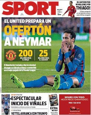 Η ισπανική εφημερίδα “Sport” σε σημερινό της πρωτοσέλιδο (27/3), αναφέρεται στο φημολογούμενο ενδιαφέρον της Μάντσεστερ Γιουνάιτεντ να αποσπάσει την υπογραφή του Νεϊμάρ, με τους Άγγλους να είναι διατεθειμένοι να προσφέρουν τα 200.000.000 ευρώ της ρήτρας αποδέσμευσής του!