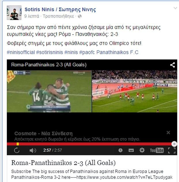 Ο άσος του Παναθηναϊκού έγραψε στο facebook: “Σαν σήμερα πριν από πέντε χρόνια ζήσαμε μία από τις μεγαλύτερες ευρωπαϊκές νίκες μας! Ρόμα – Παναθηναικός: 2-3.