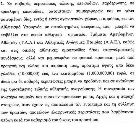 Σε περίπτωση επεισοδίων το πρώτο μέτρο που προβλέπεται από τον Νόμο “Επείγοντα μέτρα για την αντιμετώπιση της βίας στον αθλητισμό” είναι βαρύτατα πρόστιμα που ενδέχεται να φτάσουν μέχρι το 1 εκατ. ευρώ. Βάσει ωστόσο του Άρθρο 1 παρ.3 παρέχεται η δυνατότητα στον εκάστοτε Υφυπουργό Αθλητισμού να λαμβάνει ανάλογες αποφάσεις για προληπτικούς λόγους “προκειμένου να αποτραπεί η επανάληψη τέτοιων γεγονότων και συμπεριφορών”.