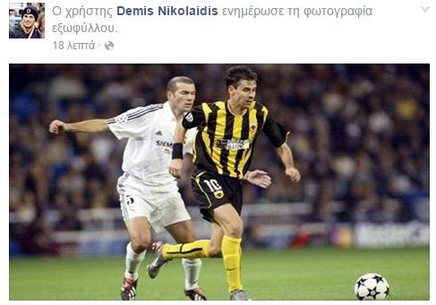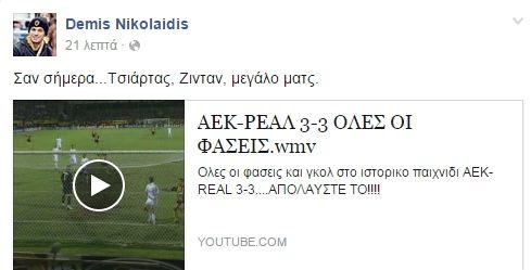 Με αφορμή τη συμπλήρωση 13 ετών από τη σπουδαία αναμέτρηση της ΑΕΚ κόντρα Ρεάλ Μαδρίτης, ο Ντέμης Νικολαΐδης ανέβασε το VIDEO του αγώνα στην επίσημη σελίδα στο facebook, αποθεώνοντας τους Βασίλη Τσιάρτα και Ζινεντίν Ζιντάν. Παράλληλα, έβαλε ως εξώφυλλο μία φωτογραφία των δύο ποδοσφαιριστών.