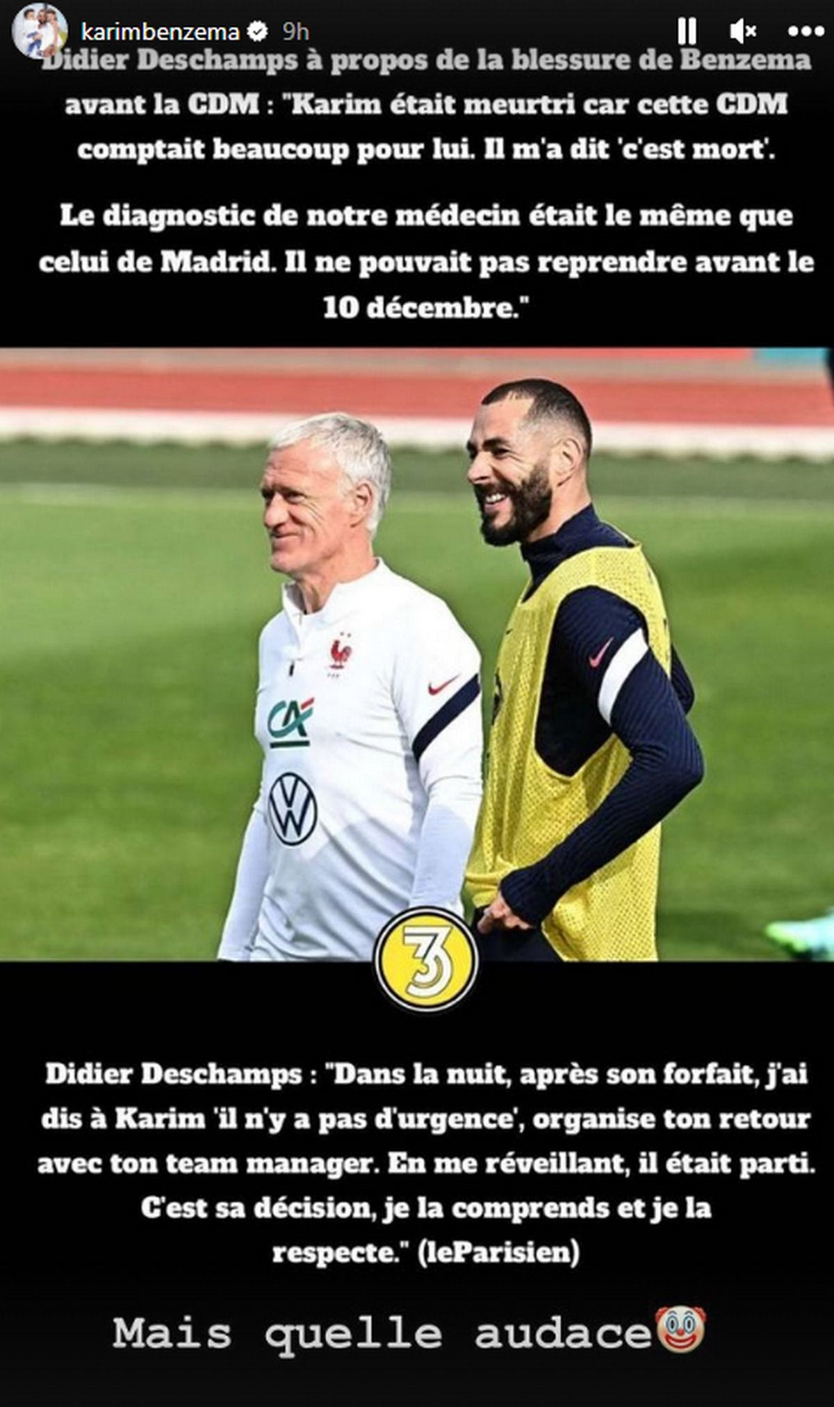 Σε όλα αυτά τα επεισόδια ήρθε να προστεθεί και η συνέντευξη του εκλέκτορα των Μπλε στην Parisien. Στη συγκεκριμένα εφημερίδα ο Ντεσάμπ εξήγησε από τη δική του σκοπιά το στόρι με τον Μπενζεμά. Ο επίλογος αυτής της ιστορία ήταν ο πολύπειρος φορ να τον ανεβάσει στα social media με emoji κλόουν.