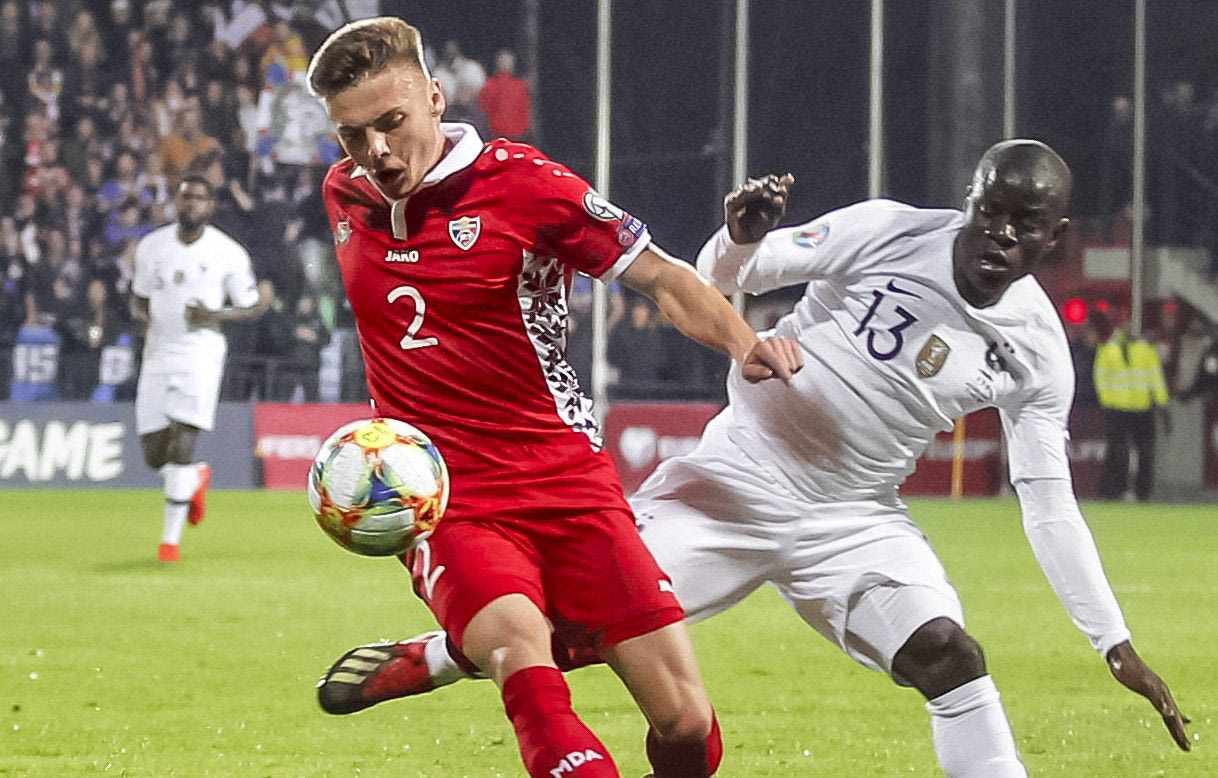 Ο Όλεγκ Ρέαμπτσιουκ έχει στην πλάτη του τον Ενγκολό Καντε κατά την αναμέτρηση της Μολδαβίας με τη Γαλλία AP Photo/ Roveliu Buga