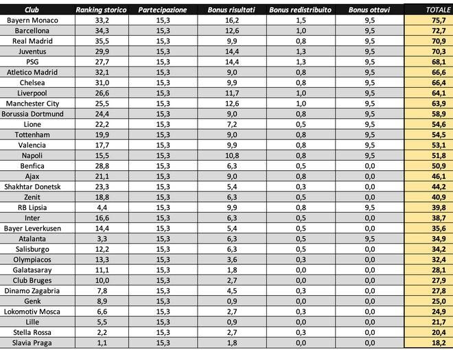 Ο Ολυμπιακός βρίσκεται στην 24η θέση, με εξασφαλισμένα 32.400.000 ευρώ. Αυτά χωρίζονται σε 4 τομείς, με πιο σημαντικό από όλους, το μπόνους συμμετοχής στη φάση των ομίλων, που είναι ισόποσο για όλες τις ομάδες και ανέρχεται σε 15.300.000 ευρώ. Από εκεί και πέρα, θα εισπράξει 13.300.000 ευρώ λόγω του νεοσύστατου θεσμού των ‘μετοχών’ της διοργάνωσης, η αξία των οποίων υπολογίζεται από τη 10ετή παρουσία της ομάδας στο Champions League. Η ομάδα με τη μικρότερη/χειρότερη παρουσία εισπράττει περίπου 1.100.000 ευρώ και από εκεί και πέρα το ποσό αυξάνεται κατά 1.100.000 ευρώ για κάθε ομάδα που βρίσκεται ψηλότερα σε αυτό το ranking, μέχρι τα 35.500.000 ευρώ της Ρεάλ Μαδρίτης.