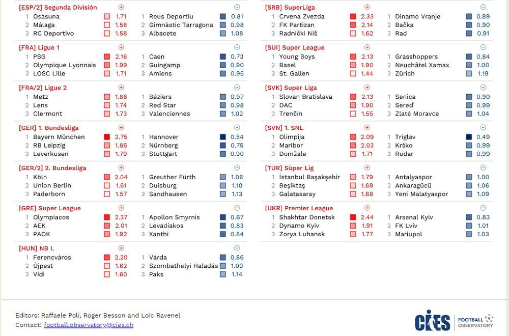 Σε μια ακόμη ξεχωριστή μέτρηση, που ονομάζει “production champions“, το CIES επιχειρεί να αποκωδικοποιήσει τους πόντους που θα έπρεπε να κερδίζουν ανά παιχνίδι οι ομάδες, με βάση την παραγωγικότητα τους στο χορτάρι. Αυτοί οι εικονικοί πόντοι προκύπτουν από το στατιστικό μοντέλο που περιλαμβάνει τα σουτ on target ειδικά και μέσα από την περιοχή γενικά, που επιχείρησαν ή δέχτηκαν οι ομάδες, σε συνδυασμό με την κατοχή μπάλας.