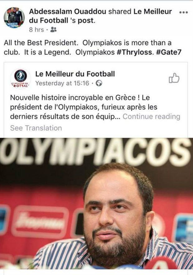 Στον λογαριασμό που διατηρεί στο Facebook, ο 39χρονος πλέον Ουαντού “ανέβασε” ένα γαλλικό δημοσίευμα που αναφερόταν στα μέτρα Μαρινάκη για να… μαζευτεί η κατάσταση στου Ρέντη, όπως το πρόστιμο των 400.000 ευρώ.