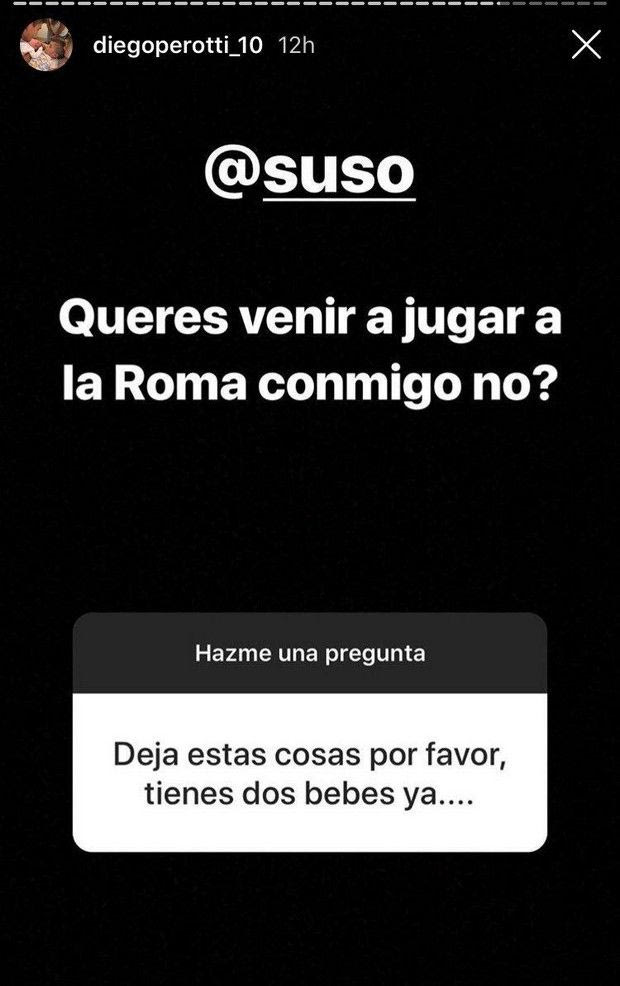 Κάποιος όμως (έκανε πως) δεν άκουσε την κρυστάλλινη τοποθέτηση του Σούσο και θέλησε να κάνει μία τελευταία προσπάθεια! Αυτός ήταν ο Ντιέγκο Περότι που χρησιμοποίησε το λογαριασμό του στο Instagram για να ρωτήσει τον Ισπανό: “Θέλεις να έρθεις να παίξεις μαζί μου στην Ρόμα;”