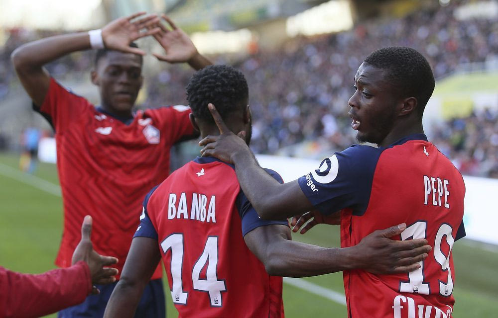 Ο Νικολά Πεπέ πανηγυρίζει με τον Ζονατάν Μπαμπά, το γκολ που πέτυχε στην αναμέτρηση με την Ναντ στο 'Beaujoire Stadium' (2-3) στις 31/03/2019 (AP Photo/David Vincent) AP