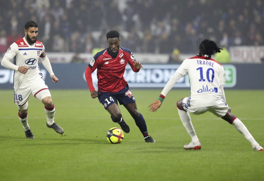 Ο Ζονατάν Μπαμπά σε προσπάθεια του ανάμεσα στους Ναμπίλ Φεκίρ και Μπερτράντ Τραορέ της Λυών (AP Photo/Laurent Cipriani) AP