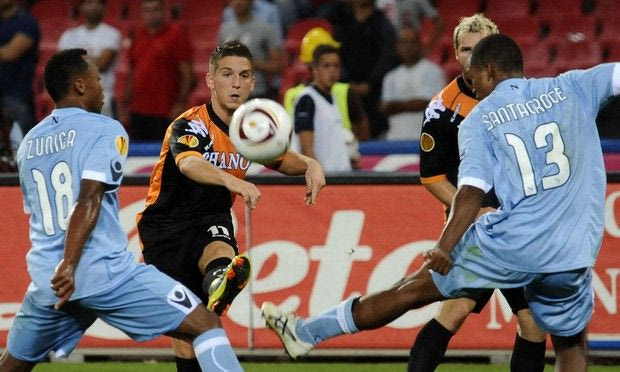 Utrecht's Dries Mertens tries a shot as Napoli's Juan Camilo Zúñiga, left, of Colombia, and Fabiano Santacroce, right, try to oppose him during an Europa League, Group K, soccer match between Napoli and Utrecht at the San Paolo stadium in Naples, southern Italy, Thursday, Sept 16, 2010. (AP Photo/Salvatore Laporta) ASSOCIATED PRESS