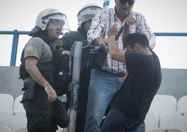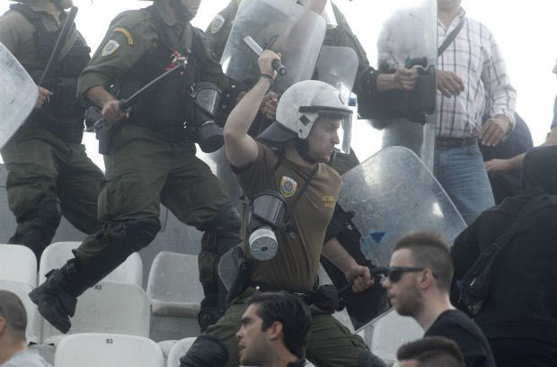 Πάμε και στην Καλλιθέα που τα ΜΑΤ εισέβαλαν στις κερκίδες και χτύπησαν οπαδούς. Ο λόγος για τον οποίο προκλήθηκε τέτοια φασαρία, σύμφωνα με το ρεπορτάζ ήταν επειδή δύο φίλαθλοι της Αναγέννησης τσακώθηκαν μεταξύ τους.