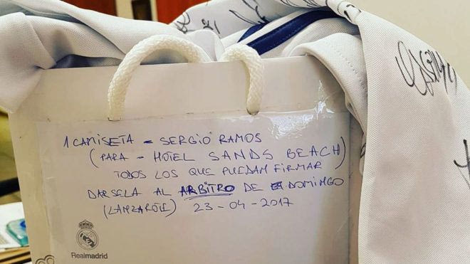Στη φωτογραφία φαίνεται μία τσάντα της Ρεάλ Μαδρίτης, στην οποία βρίσκεται η υπογεγραμμένη φανέλα του Ράμος. Σύμφωνα με την πρώτη είδηση, ο Ράμος έδωσε τη φανέλα αυτή ως δώρο στον διαιτητή της αναμέτρησης, πριν τον αγώνα!