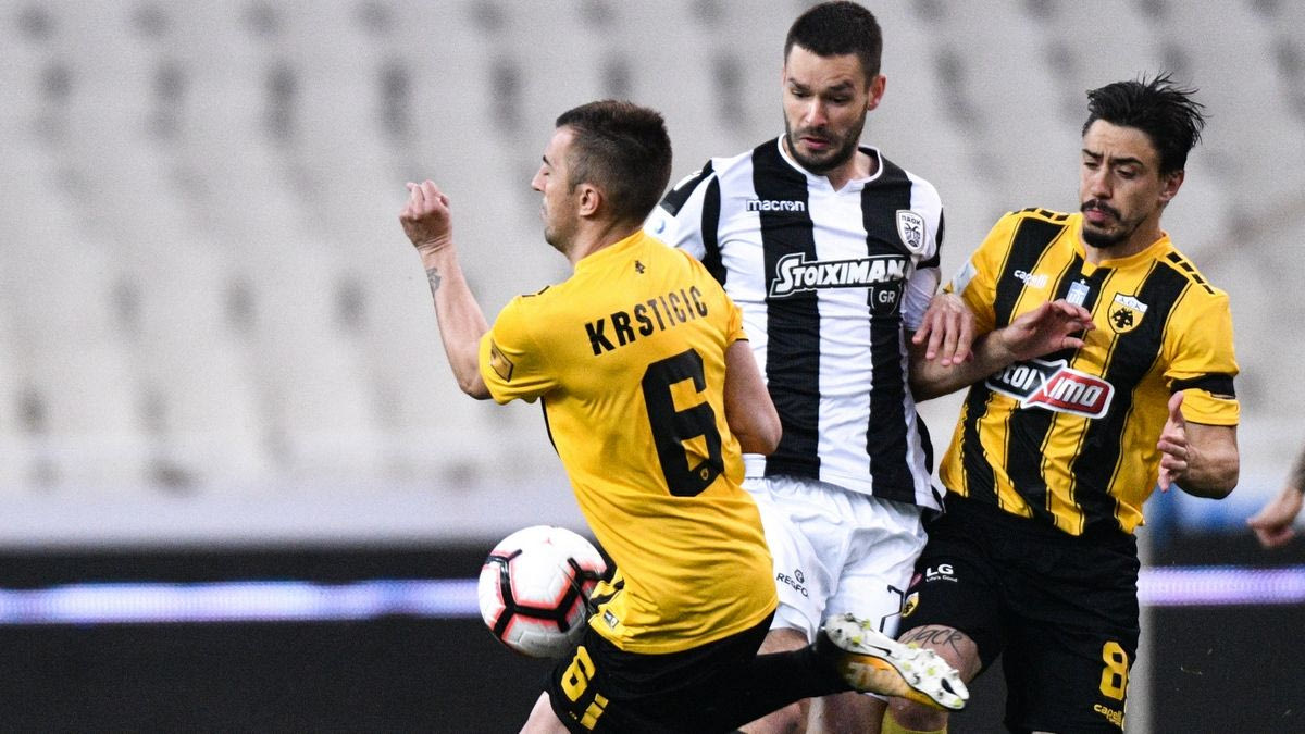 Ο Σάκχοφ μονομαχεί με τους Κρίστιτσιτς και Σιμόες στον τελικό του Κυπέλλου 2018-2019, ανάμεσα σε ΠΑΟΚ και ΑΕΚ. ΦΩΤΟΓΡΑΦΙΑ: ΑΝΤΩΝΗΣ ΝΙΚΟΛΟΠΟΥΛΟΣ / EUROKINISSI