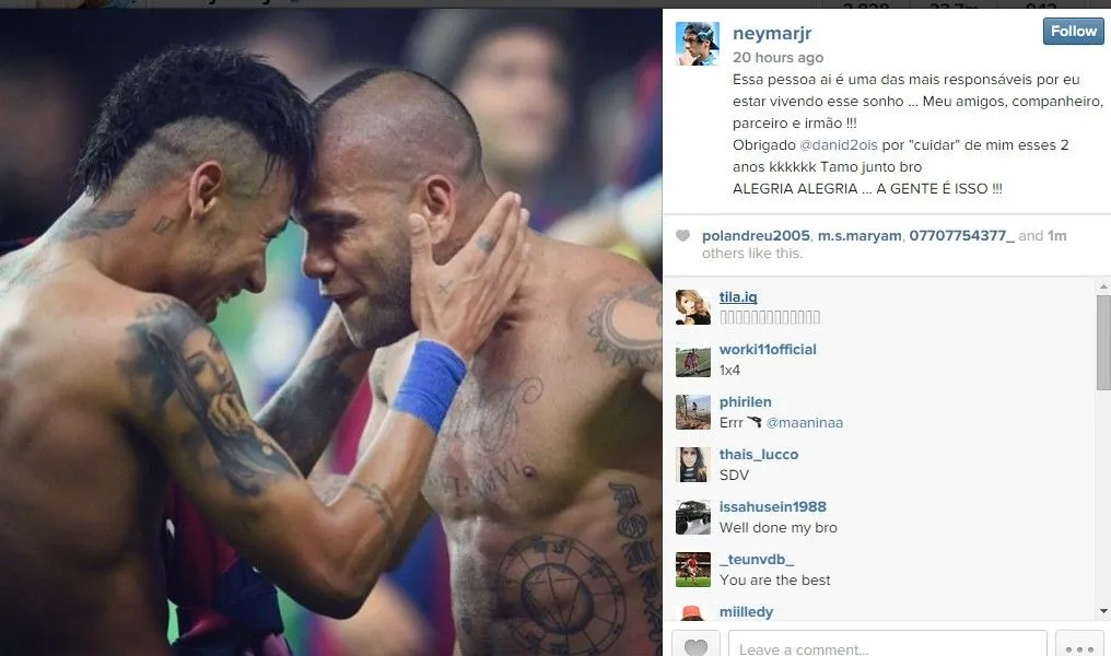 “Αυτός ο άνθρωπος είναι που έκανε το όνειρο μου πραγματικότητα. Φίλος, αδερφός, συνάδελφος. Σε ευχαριστώ που με φρόντιζες αυτά τα δύο χρόνια. Σε αγαπώ Ντάνι. Ευτυχία, ευτυχία”, ήταν το μήνυμα του Νεϊμάρ στον συμπατριώτη του”.