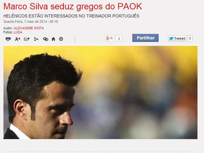 Το όνομα του Μάρκο Σίλβα αναφέρουν οι Πορτογάλοι για την θέση του τεχνικού του ΠΑΟΚ. Συγκεκριμένα η ιστοσελίδα desporto.sapo.pt επικαλείται ρεπορτάζ της εφημερίδας “Record” και κάνει λόγο για ενδιαφέρον του “Δικεφάλου” για τον 37χρονο προπονητή.