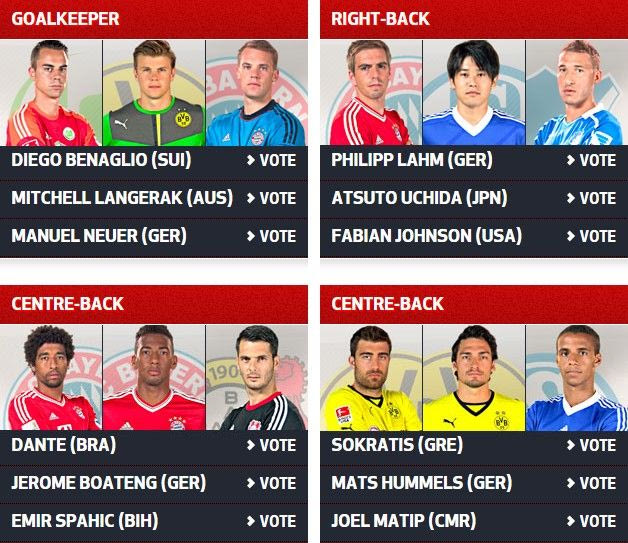 Στην εν λόγω ψηφοφορία οι φίλαθλοι καλούνται να αποφασίσουν για τη θέση του τερματοφύλακα και της αμυντικής τετράδας, ενώ ο διεθνής αμυντικός είναι “αντιμέτωπος” με το συμπαίκτη του Ματς Χούμελς και τον Τζόελ Ματίπ της Σάλκε.