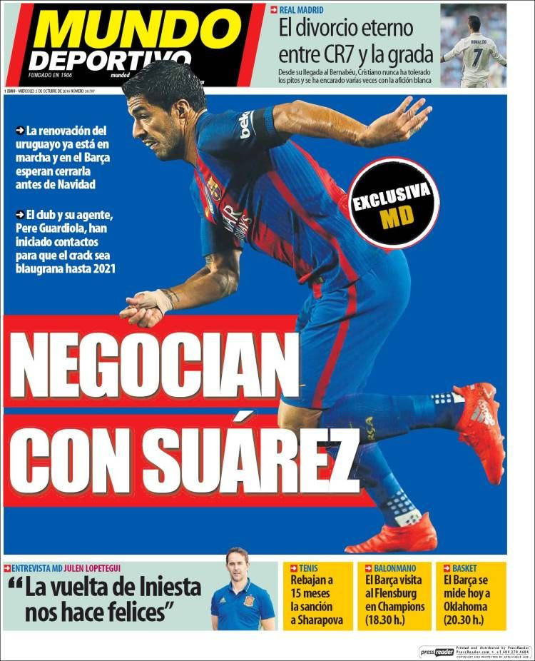 Η “Mundo Deportivo” αποκάλυψε πως ο μάνατζερ του Σουάρες και αδερφός του Πεπ Γκουαρδιόλα, Πέρε, είχε συνάντηση με τους διοικούντες τον σύλλογο στα τέλη Σεπτεμβρίου προκειμένου οι δύο πλευρές να καταλήξουν σε συμφωνία που θα κρατήσει τον Ουρουγουανό στο “Camp Nou” μέχρι το 2021, όταν και θα είναι 34 ετών.