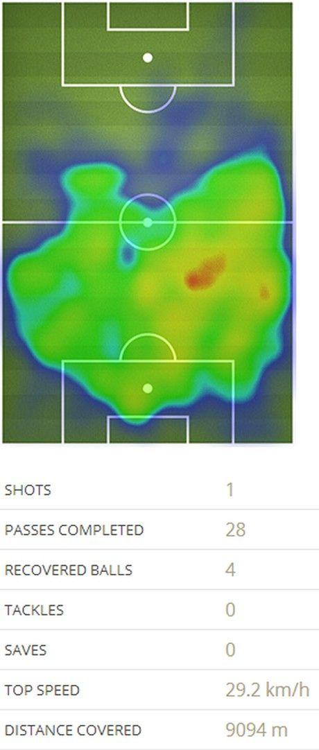 Αυτήν τη φορά ήταν πιο ενεργός στα ανασταλτικά καθήκοντά του (3/4 τάκλιν, 3 διωξίματα με το κεφάλι, ένα κλέψιμο πάσας αντιπάλου, δύο κερδισμένες εναέριες μονομαχίες), αλλά δύο φάσεις στις οποίες συμμετείχε ήταν αρκετές για να φέρουν την καταστροφή και στην εθνική Αγγλίας.