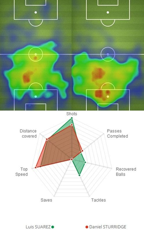 Με τον Νίκολας Λοδέιρο να καλύπτει σχεδόν 10 χιλιόμετρα σε 66 λεπτά και τον Έντινσον Καβάνι να τρέχει (όπως συνηθίζει) μονίμως για να βοηθήσει στην περιοχή του Φερνάντο Μουσλέρα κάθε φορά που άλλαζε η κατοχή της μπάλας, ο Σουάρες βοηθήθηκε πάρα πολύ ακόμα και από τους πιο κοντινούς συμπαίκτες του. Ακόμα κι έτσι, όμως, ανασταλτικά ήταν ανώτερος από τον συμπαίκτη του στη Λίβερπουλ και αντίπαλο φορ, Ντάνιελ Στάριτζ.