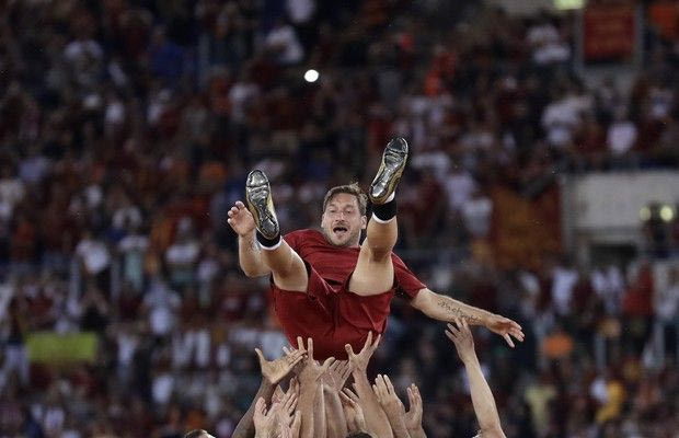 Roma's Francesco Totti is tossed in the air by his teammates after an Italian Serie A soccer match between Roma and Genoa at the Olympic stadium in Rome, Sunday, May 28, 2017. Francesco Totti played his final match with Roma against Genoa after a 25-season career with his hometown club. (AP Photo/Alessandra Tarantino) AP