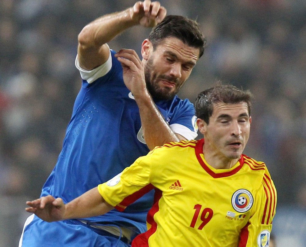 Ο Αλέξανδρος Τζιόλης σε κερδισμένη, εναέρια, μονομαχία κατά τη διάρκεια του αγώνα με τη Ρουμανία στο Βουκουρέστι ACTION IMAGES PRESS AGENCY