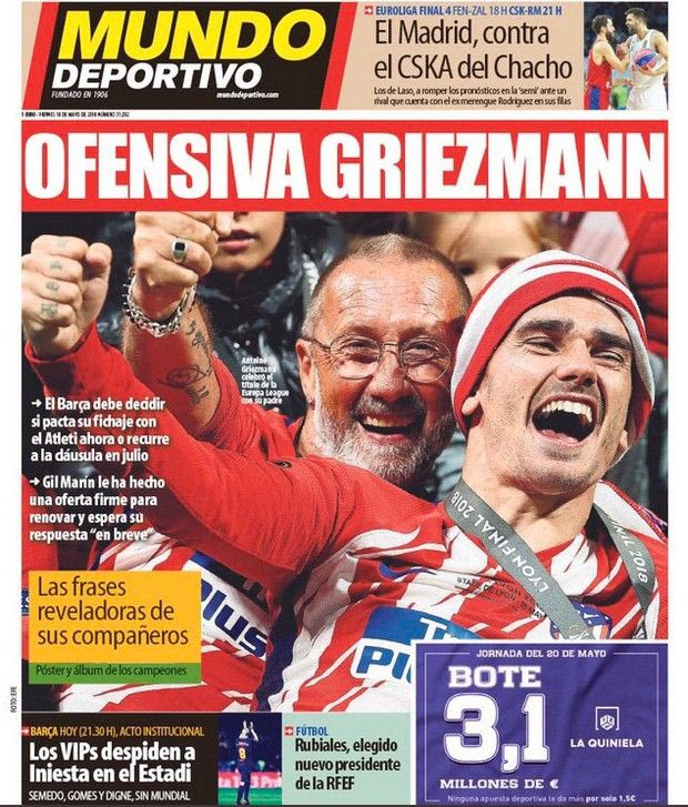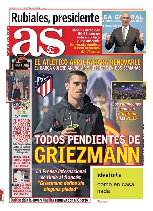 Και μέσα σε όλα αυτά υπάρχει και η μαδριλένικη “As”, σύμφωνα με την οποία “ο πρόεδρος της Μπαρτσελόνα θέλει να ανακοινώσει εντός δύο εβδομάδων την απόκτηση του Γκριεζμάν, πριν από την έναρξη του Μουντιάλ. Όλα εξαρτώνται από τον παίκτη”.