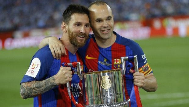 Barcelona's Lionel Messi, left and captain Andres Iniesta pose with the trophy after the Copa del Rey final soccer match between Barcelona and Alaves at the Vicente Calderon stadium in Madrid, Spain, Saturday, May 27, 2017. Barcelona won the match 3-1. (AP Photo/Francisco Seco) AP