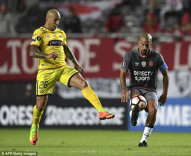 Gabriel Marques of Ecuador's Barcelona, left, battles for the ball against Juan Sebastian Veron of Argentina's Estudiantes during a Copa Libertadores soccer match in La Plata, Argentina, Tuesday, April 11, 2017. (AP Photo/ Gustavo Garello) AP