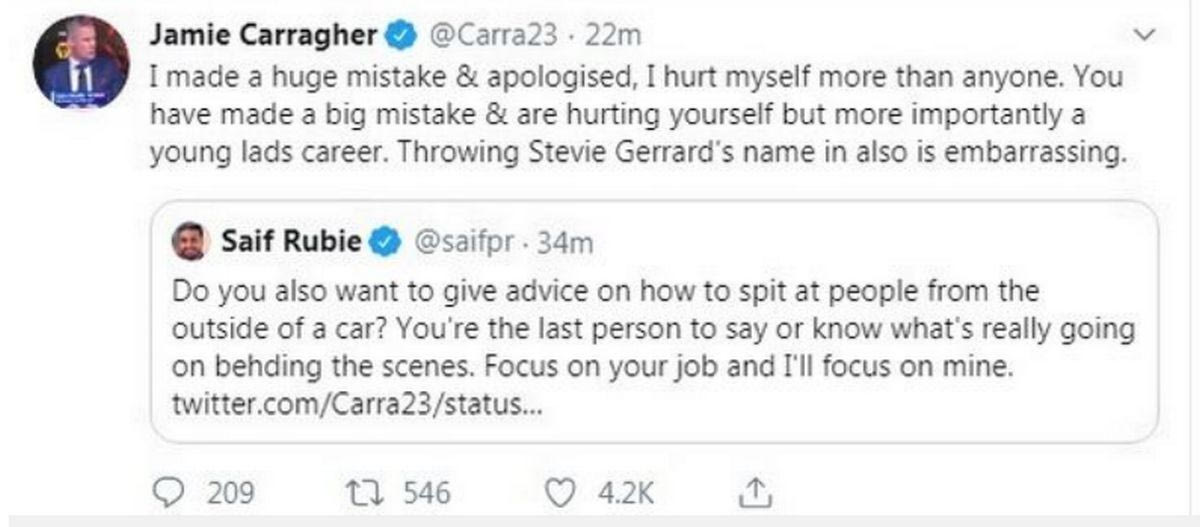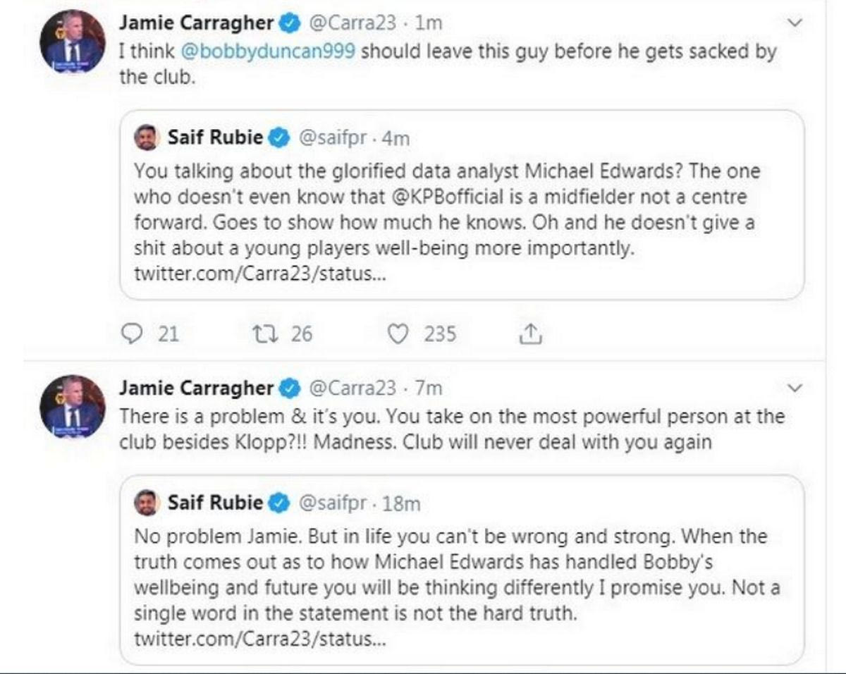 Αυτή τοποθέτηση του Ρουμπιέ έφερε αντιδράσεις. Τόσο της επίσημης Λίβερπουλ, όσο και των Τζέιμι Κάραχερ, Ντάνι Μέρφι. “H Λίβερπουλ γνωρίζει και είναι απογοητευμένη για τους αβάσιμους ισχυρισμούς που έγιναν στα μέσα ενημέρωσης σχετικά με έναν από τους παίκτες μας. Δεδομένου ότι τα συμφέροντα του εν λόγω παίκτη δεν εξυπηρετούνται καλύτερα από ανακριβείς εικασίες, πομπώδεις δηλώσεις ή δημόσια αντιπαράθεση, δεν θα κάνουμε περαιτέρω σχόλια. Ωστόσο, θα συνεχίσουμε τις προσπάθειές μας να βρούμε με τον παίκτη την λύση με γνώμονα το συμφέρον όλων των εμπλεκομένων”, ήταν η επίσημη τοποθέτηση της αγγλικής ομάδας, ενώ Κάραχερ και Ρουμπιέ ήρθαν σε έντονη αντιπαράθεση στο twitter, με τον ατζέντη του Ντάνκαν λίγη ώρα μετά να ‘κατεβάζει’ τον λογαριασμό του.