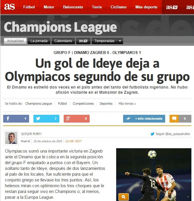 AS: “Ένα γκολ του Ιντέγε διατήρησε δεύτερο τον Ολυμπιακό στον όμιλό του”