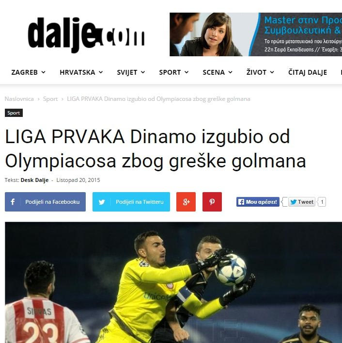 Dalje.com: “Η Ντιναμό έχασε από λάθος του τερματοφύλακα”