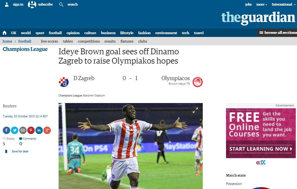 The Guardian: “Το γκολ του Μπράουν Ιντέγε αύξησε τις ελπίδες του Ολυμπιακού”