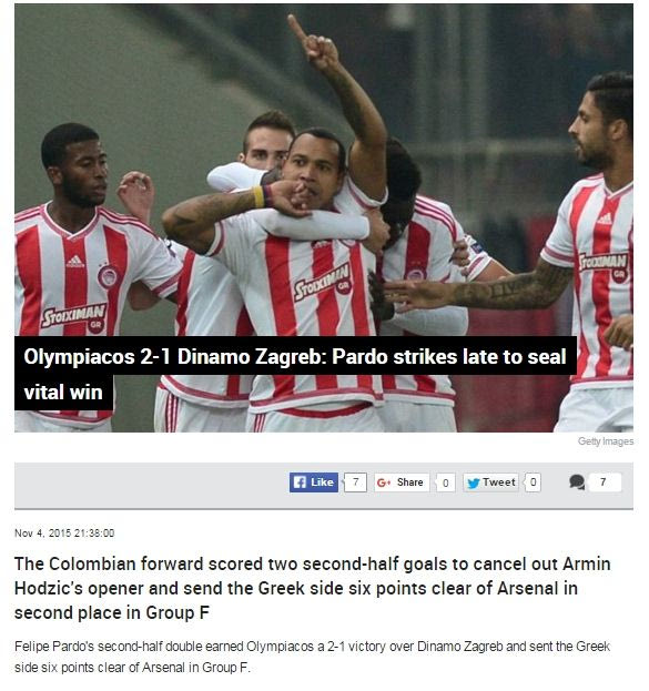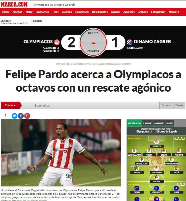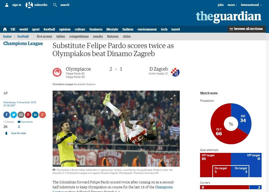 Με μεγάλο πρωταγωνιστή τον Φελίπε Πάρντο, ο Ολυμπιακός έκανε τη μεγάλη ανατροπή και νίκησε με 2-1 την Ντιναμό Ζάγκρεμπ στο “Γ. Καραϊσκάκης”. Τα ξένα ΜΜΕ ασχολήθηκαν με τη νίκη των “ερυθρόλευκων”, αλλά και με τον τρόπο που αυτή ήρθε.