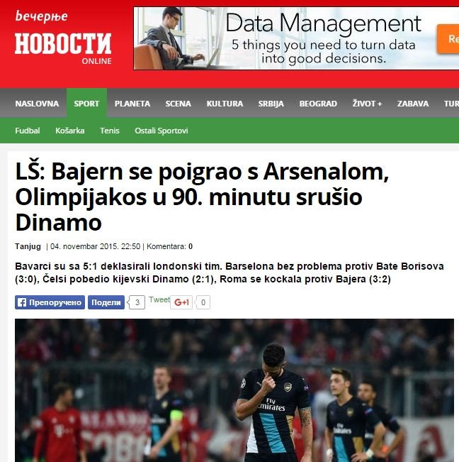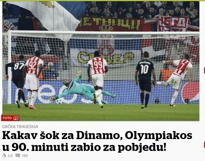 Η σερβική ιστοσελίδα ” novosti.rs” αναφέρει: “Ο Ολυμπιακός πήρε τη νίκη στο 90 κόντρα στην Ντιναμό”. Παράλληλα, έχει ως πρώτο θέμα τη “φανταστική χορογραφία”.