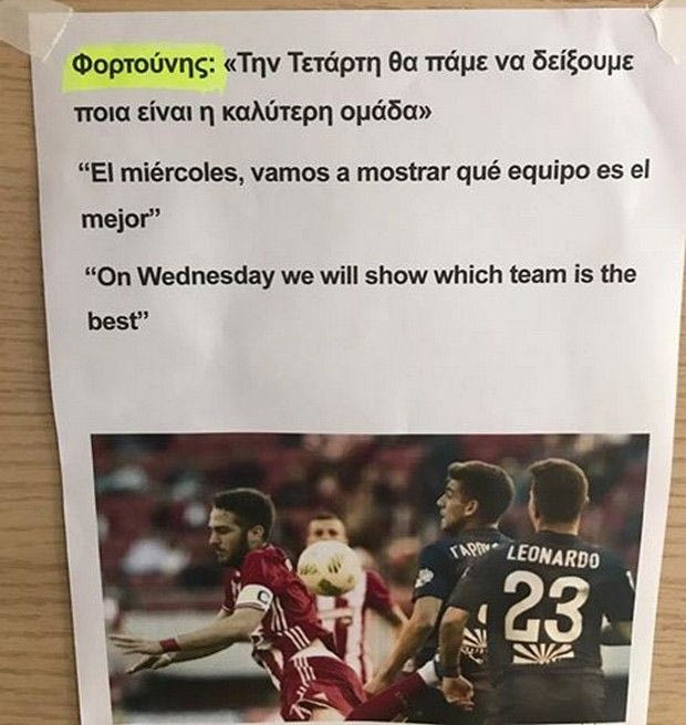 “Την Τετάρτη θα πάμε να δείξουμε ποια είναι η καλύτερη ομάδα”, ανέφερε η σχετική δήλωση που ήταν μεταφρασμένη και σε αγγλικά και σε ισπανικά ώστε να την καταλάβουν και οι ξένοι ποδοσφαιριστές του “Δικέφαλου”, με τον Μανόνο Χιμένεθ να χρησιμοποιεί αυτή τη δήλωση για να τους “φτιάξει” ψυχολογικά και να δώσουν τον καλύτερο εαυτό τους στο ντέρμπι.