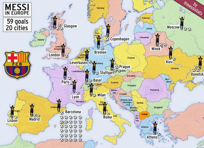Τα 59 γκολ του Λιονέλ Μέσι στο Champions League έχουν σημειωθεί σε 20 διαφορετικές πόλεις, επίδοση που αποτελεί ρεκόρ, αφού ο Ραούλ είχε βρει δίχτυα σε 19.