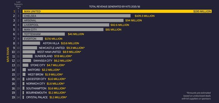 Ένα από το βασικότερα έσοδα των ποδοσφαιρικών ομάδων προέρχονται από τις φανέλες τους. Όχι τόσο από τις πωλήσεις που κάνουν όσο από τα συμβόλαια με την εταιρεία που τις σχεδιάζει και με τον χορηγό που φέρει η κάθε φανέλα πάνω της. Το Espn.com έκανε ένα αφιέρωμα στα έσοδα που έχει κάθε ομάδα της Premier League από τις φανέλες της (πλην πωλήσεων) και μας παρουσιάζει τα αποτελέσματα.