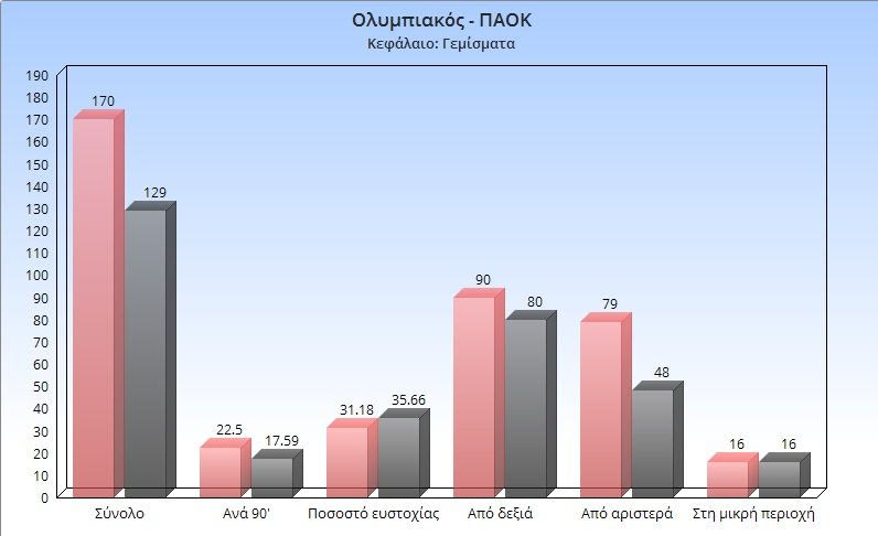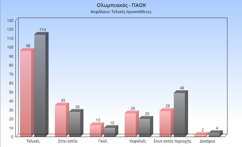 Ο Ολυμπιακός έχει περισσότερες τελικές στην εστία από τον ΠΑΟΚ, και σε αυτό παίζει ρόλο και οι 20 περισσότερες τελικές που έχει ο ΠΑΟΚ έξω από τη μεγάλη περιοχή σε σχέση με τον Ολυμπιακό. Σε επίπεδο κεφαλιών, ο Ολυμπιακός έχει έξι περισσότερες, ενώ όσον αφορά τα γκολ, ο ερυθρόλευκοι είναι στο +3 έχοντας όμως τέσσερα πέναλτι υπέρ (όλα εύστοχα) έναντι κανενός του Δικεφάλου του βορρά. Τέλος δυο από τις τελικές προσπάθειες του Ολυμπιακού κατέληξαν στο δοκάρι, με τον ΠΑΟΚ να έχει διπλάσια δοκάρια.