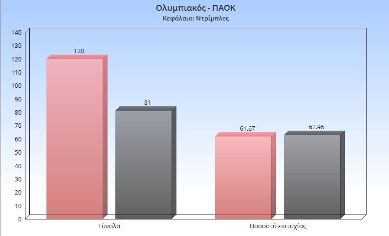 Στις ντρίμπλες, ο Ολυμπιακός υπερτερεί σε ποσότητα, καθώς έχει καταγράψει 120, έναντι 81 του ΠΑΟΚ, με τον Δικέφαλο του βορρά να υπερτερεί έστω και στο ελάχιστο (κάτα σχεδόν 1,5 ποσοστιαία μονάδα) από τους ερυθρόλευκους.
