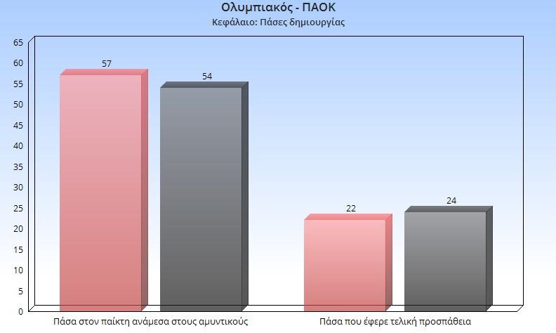 Στις πάσες, υπάρχουν δυο ειδικές κατηγορίες που έχουν να κάνουν με τις πάσες στην επίθεση. Η πρώτη κατηγορία είναι οι“through passes”,και είναι αυτές που γίνονται με στόχο τον παίκτη που βρίσκεται ανάμεσα στο κεντρικό αμυντικό δίδυμο του αντιπάλου. Ο Ολυμπιακός έχει τρεις πάσες περισσότερες από τον ΠΑΟΚ, με το ποσοστό ευστοχίας των δυο ομάδων να απέχει μια ποσοστιαία μονάδα (στο 26% ο Ολυμπιακός και στο 27% ο ΠΑΟΚ). Στις“key passes”,δηλαδή εκείνες που φέρνουν τελική προσπάθεια, ο ΠΑΟΚ έχει δυο περισσότερες από τον Ολυμπιακό.