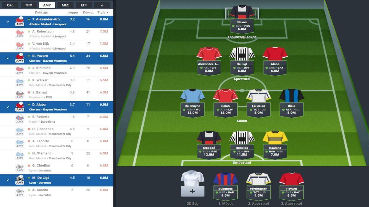 Αλεξάντερ-Άρνολντ και Αλάμπα έχουν ανεπτυγμένα δημιουργικά καθήκοντα σε Λίβερπουλ και Μπάγερν, επομένως μπορούν να προσφέρουν πόντους και μέσα από ασίστ/γκολ. Ο Ντε Λιχτ προωθείται και απειλεί σε στημένες φάσεις, κάτι που θα μπορέσει να κάνει και κόντρα στην εύθραστη άμυνα της Λυών.