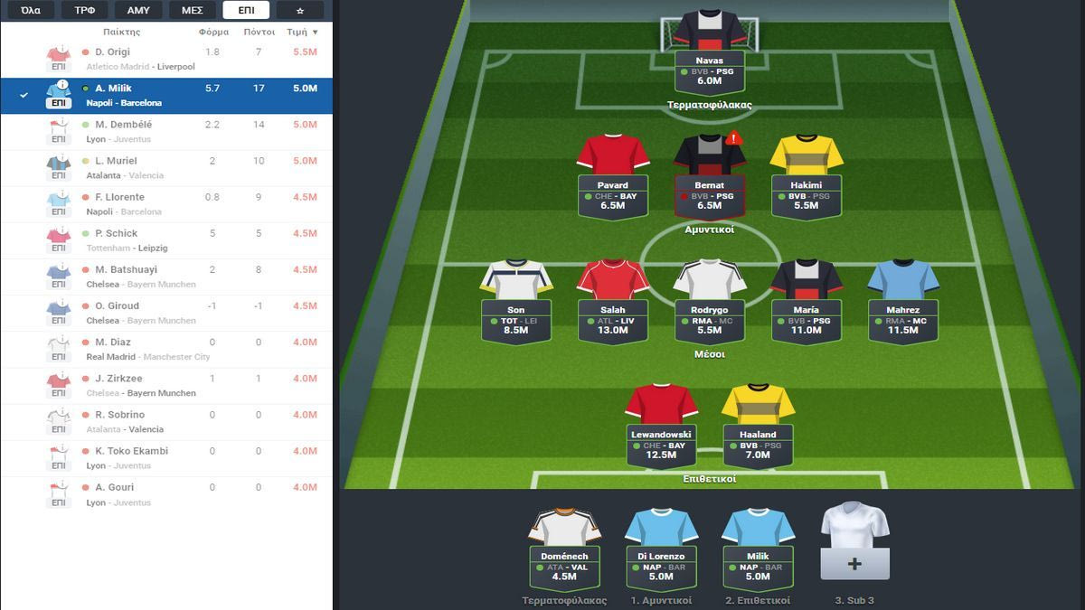 Νάβας στο τέρμα, Παβάρ, Μπερνάτ και Χακίμι στην άμυνα, Σον, Σαλάχ, Ροντρίγκο, Ντι Μαρία και Μαχρέζ οι πέντε στη μεσαία γραμμή, με τους Λεβαντόφσκι – Χάαλαντ δίδυμο στην επίθεση, σχηματίζουν το 3-5-2 που προκύπτει με βάση τους κορυφαίους (σε πόντους Fantasy) της φάσης των ομίλων. Με τα… ρέστα πάμε στους τρεις του πάγκου: Ντομενέκ, Ντι Λορέντσο και Μίλικ.