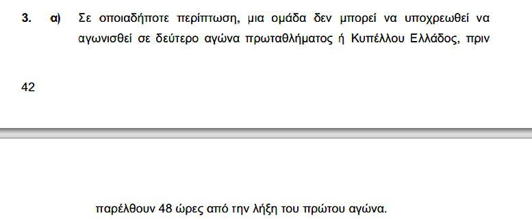 Σε οποιαδήποτε περίπτωση δεν μπορεί να υποχρεωθεί να αγωνιστεί σε αγώνα πρωταθλήματος ή Κυπέλλου πριν παρέλθουν 48 ώρες μετά τη λήξη του πρώτου αγώνα.