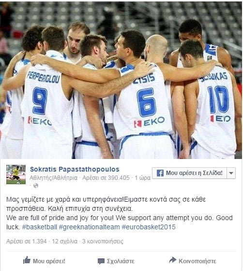 Τόσο ο επίσημος λογαριασμός του αντιπροσωπευτικού συγκροτήματος, όσο και ο Σωκράτης Παπασταθόπουλος μέσω της σελίδας του στο facebook έστειλαν τις ευχές τους για μία ακόμα καλύτερη πορεία στα νοκ άουτ του Ευρωμπάσκετ 2015.