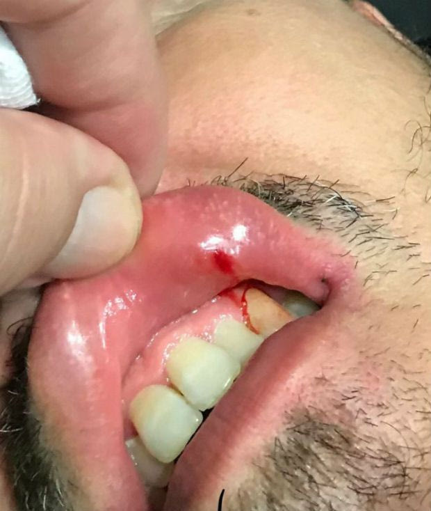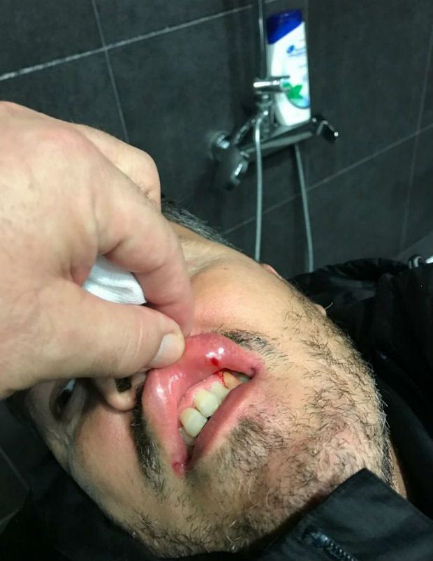 Στη φωτογραφία, ο τεχνικός των “ερυθρόλευκων” φαίνεται να έχει αίματα στο πάνω μέρος του χείλους. Επίσης τονίζουν ότι υπάρχει και ιατρικοδικαστική έκθεση για τον τραυματισμό.