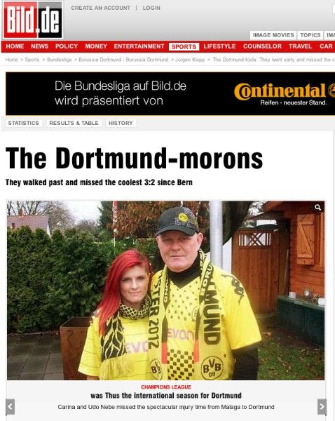 Δύο οπαδοί της Ντόρτμουντ, ο 56χρονος Ούντο Νέμπε και η 25χρονη κόρη του Κορίνα, έγιναν πρωτοσέλιδο στη Bild, καθώς είχαν τη φαεινή ιδέα να φύγουν από το γήπεδο στο 90' της αναμέτρησης με τη Μάλαγα. Έχασαν δηλαδή την ολική ανατροπή της ομάδας τους στις καθυστερήσεις.