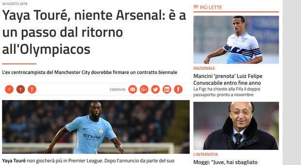 Tην ώρα που οι οπαδοί του Ολυμπιακού αδημονούν για την ανακοίνωση του deal του Ολυμπιακού με τον Γιάγια Τουρέ, οι Ιταλοί έδωσαν στη δημοσιότητα τη χρονική διάρκεια του συμβολαίου που θα υπογράψει!